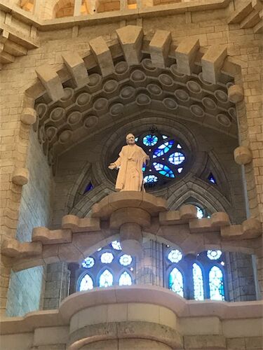 生誕のファザードをくぐって聖堂の内部に入ります。生誕のファザード上部のバラ窓と彫刻。 そして、中を見てまず驚くのが、教会の内部とは思えないほどの明るさと、奇抜なデザイン、そして空間の広がり。ガウディが思い描いていた自然の森の中にいるような明…